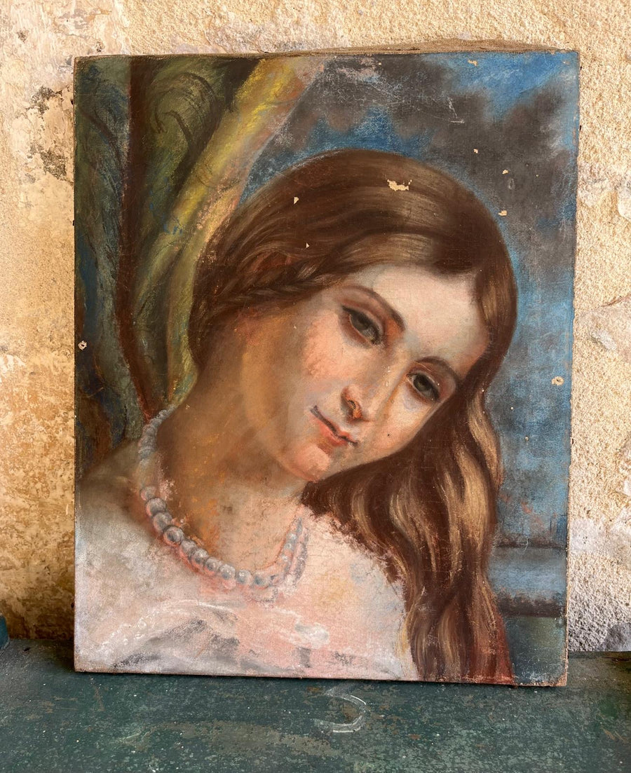Small oil portrait of girl with pearls
