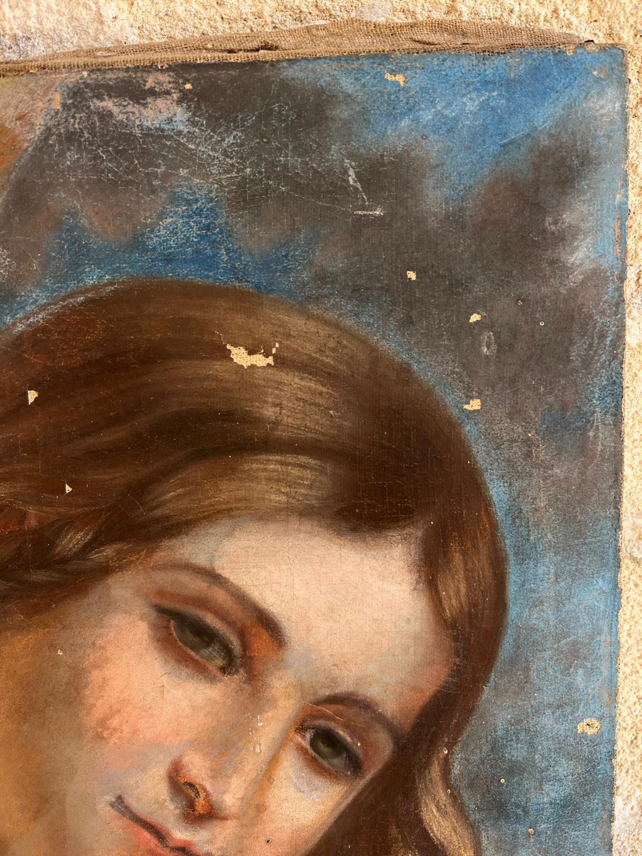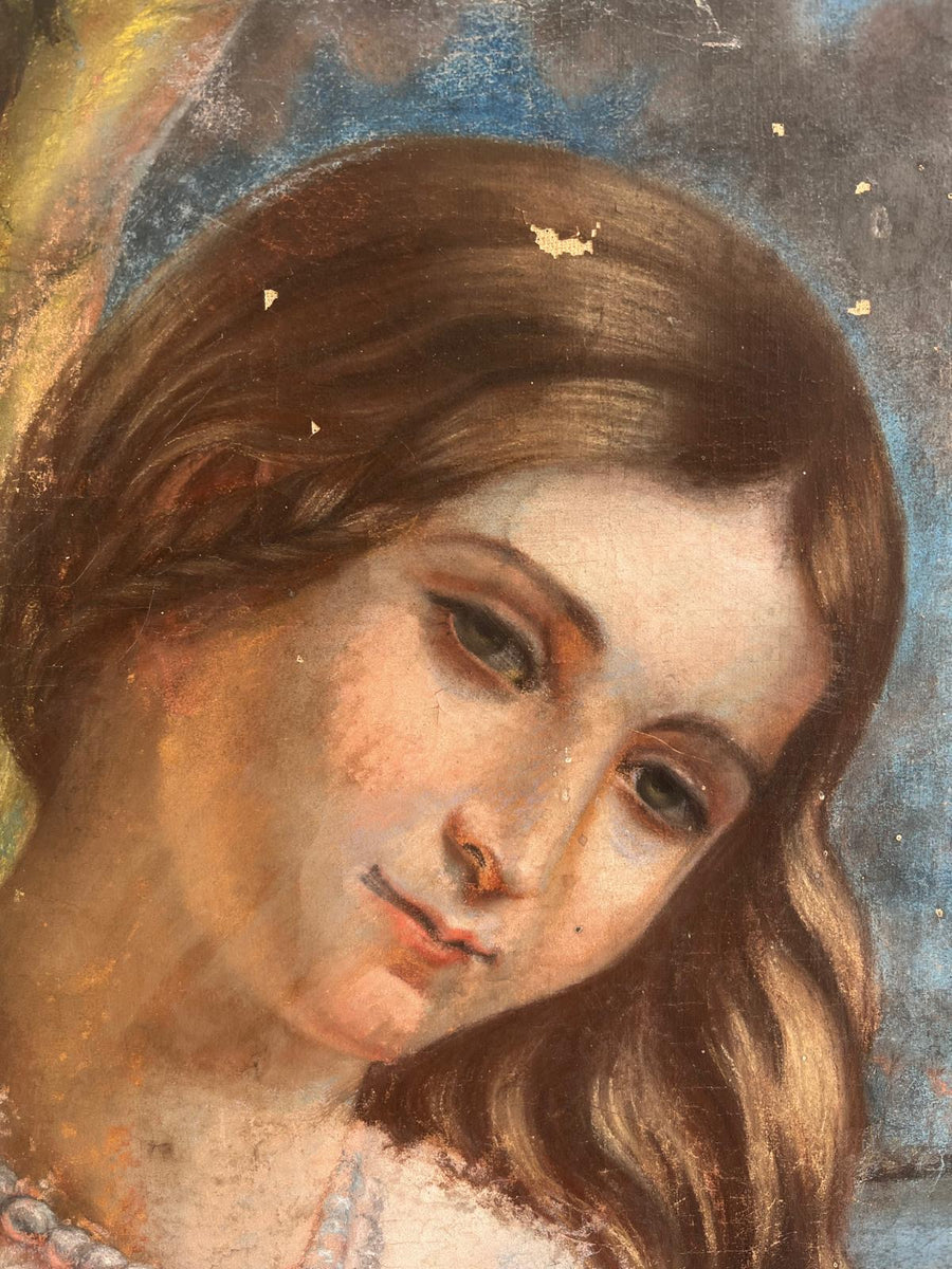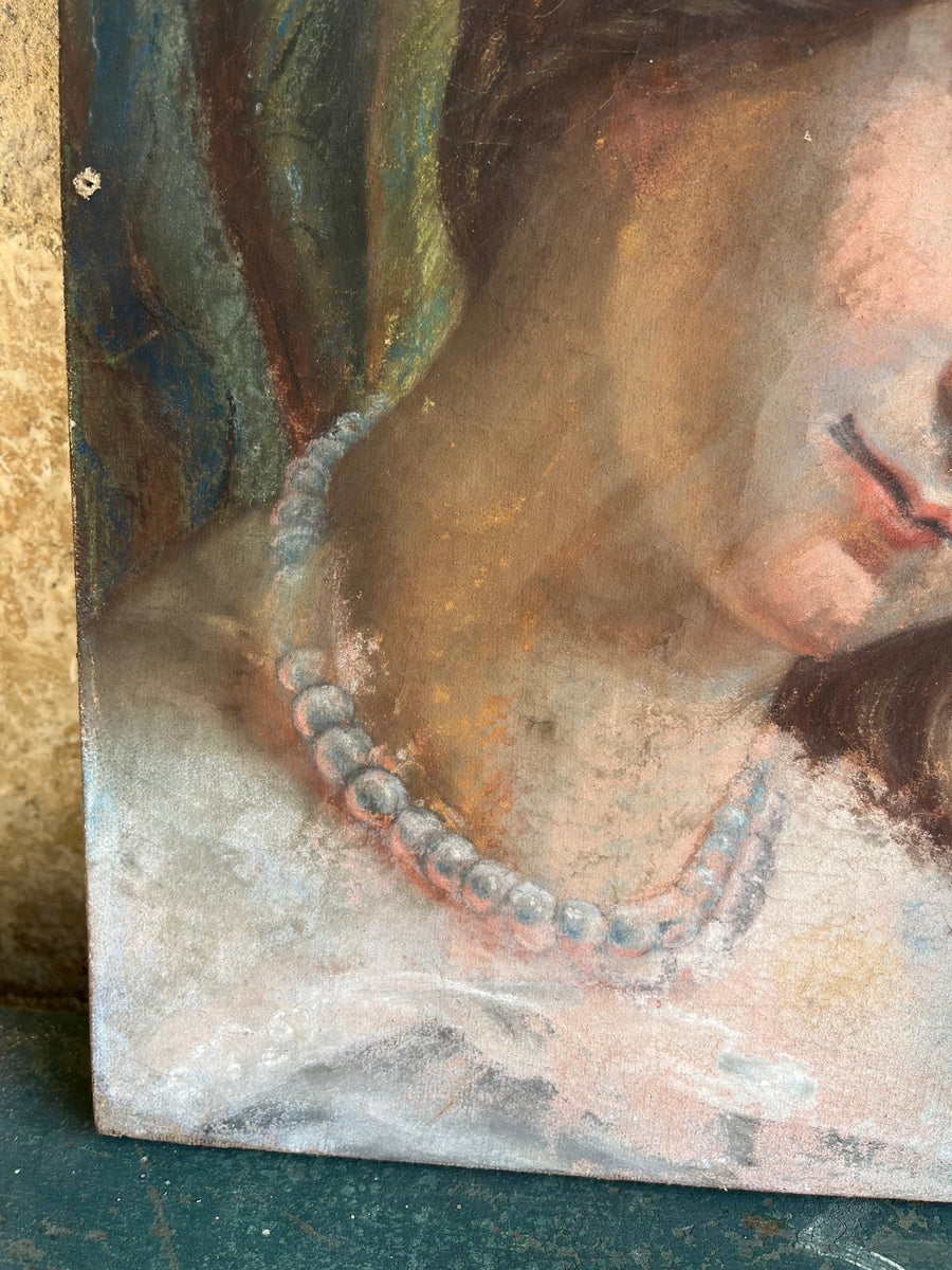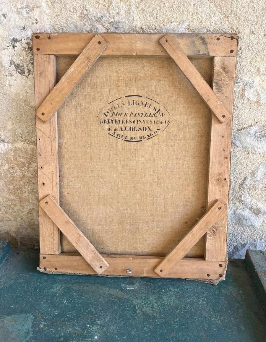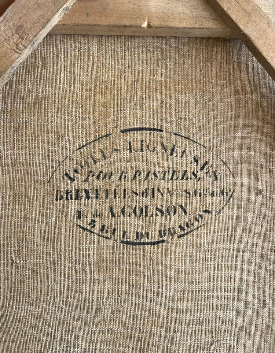Pastel on canvas of young girl wearing pearls size 33cm wide by 41cm high. A Colson the stamped name on the back refers to the fifteen year patent for wood based papers Toile Ligneuse (wooden fabric) for pastels which ran from March 1848 to January 1864. The company was taken over by Rieffel from 1851-1862 then Tardif from 1862-1872
