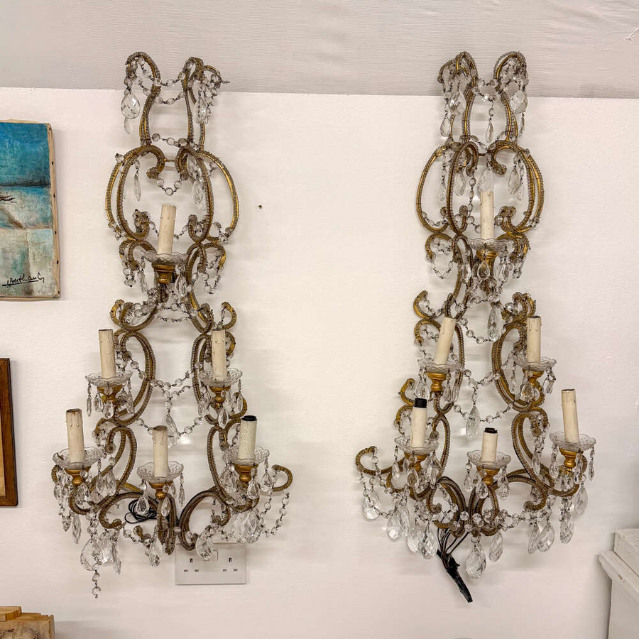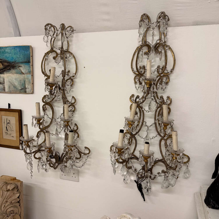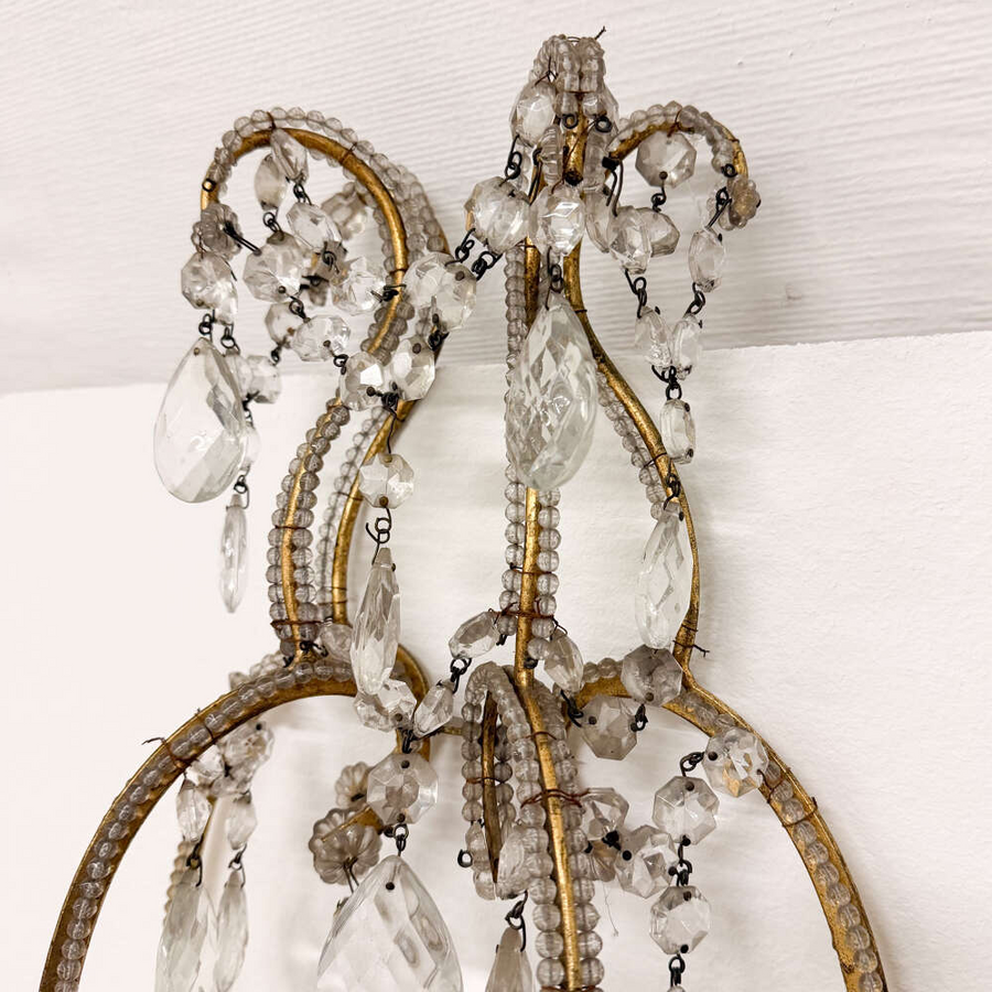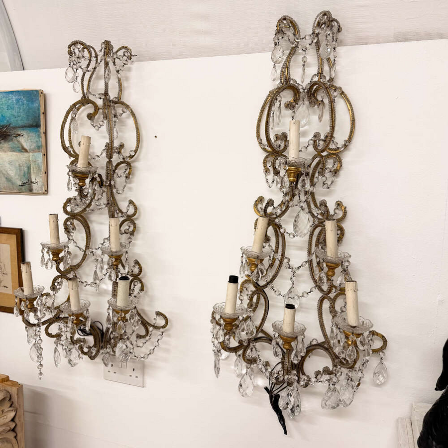 The interplay of gilt metal and hanging crystal elements creates a striking visual effect, catching and reflecting the light to add depth and atmosphere to an interior. Ideal for flanking doorways, mirrors, or fireplaces, they bring both drama and elegance to a space.