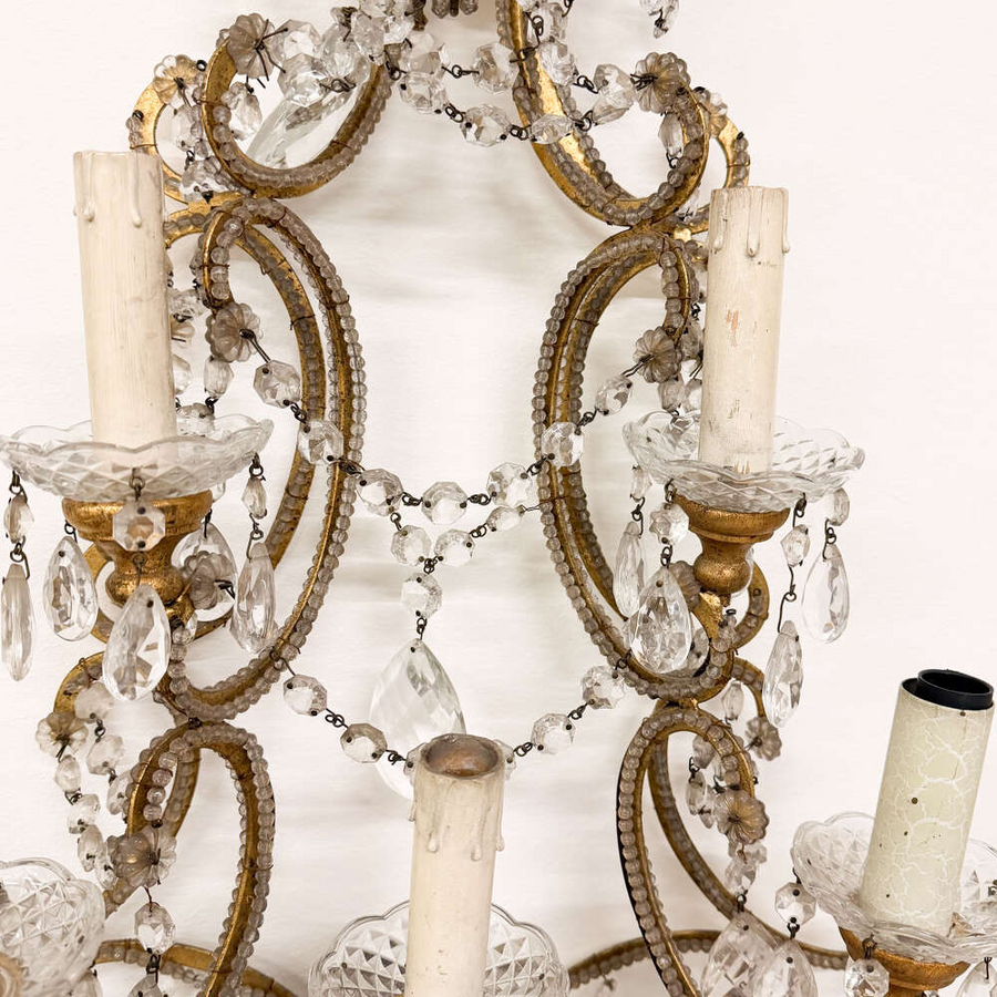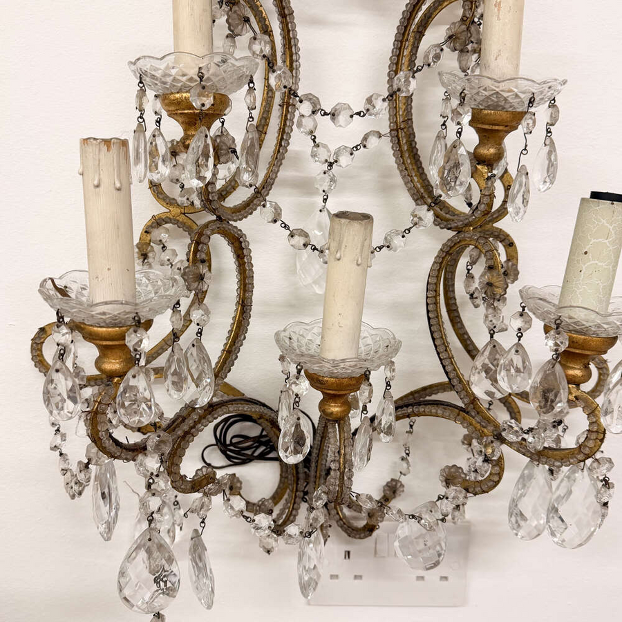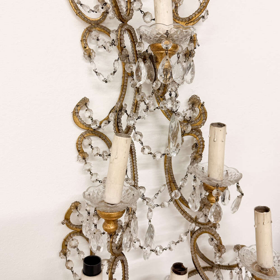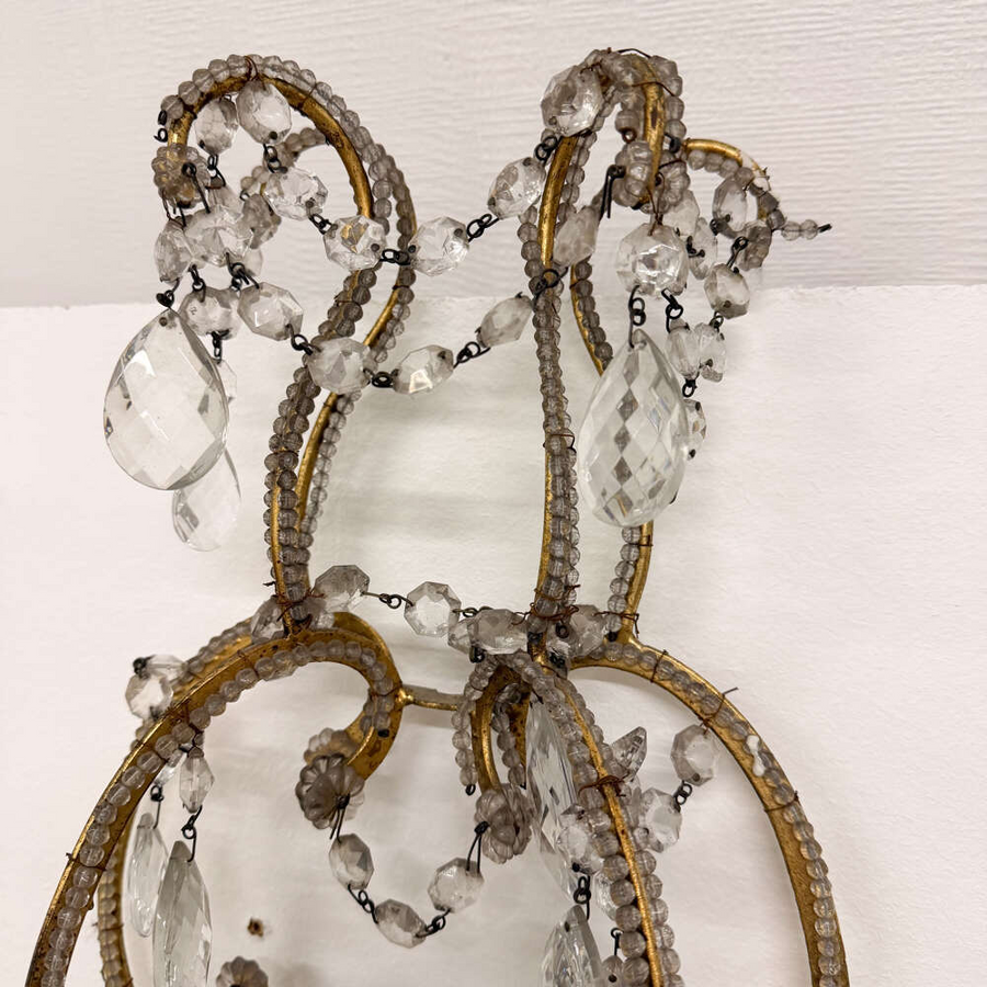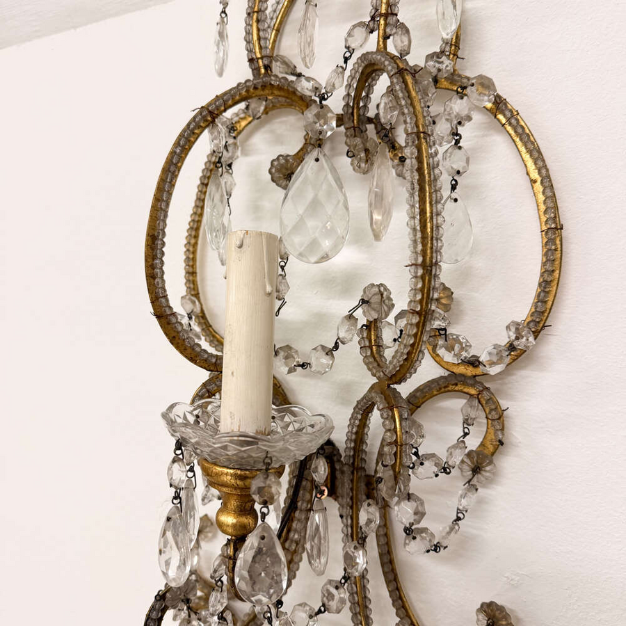 The interplay of gilt metal and hanging crystal elements creates a striking visual effect, catching and reflecting the light to add depth and atmosphere to an interior. Ideal for flanking doorways, mirrors, or fireplaces, they bring both drama and elegance to a space.