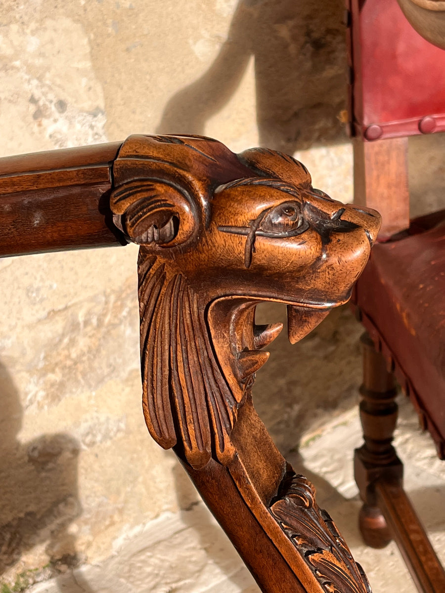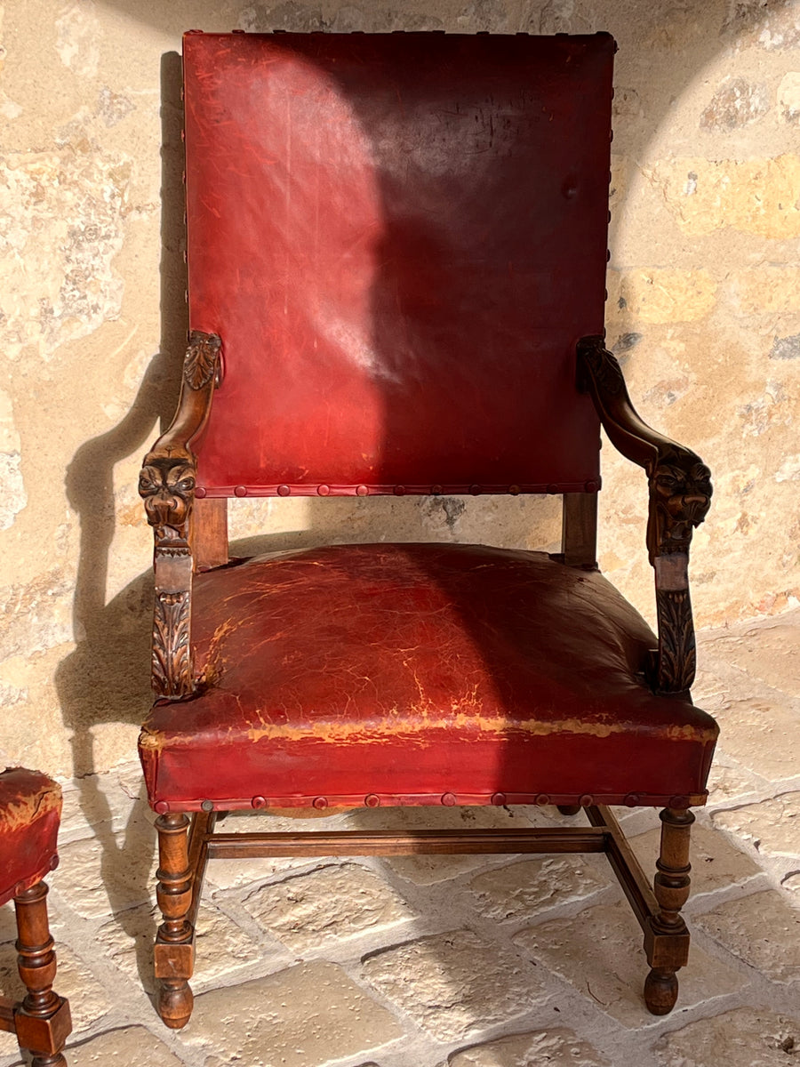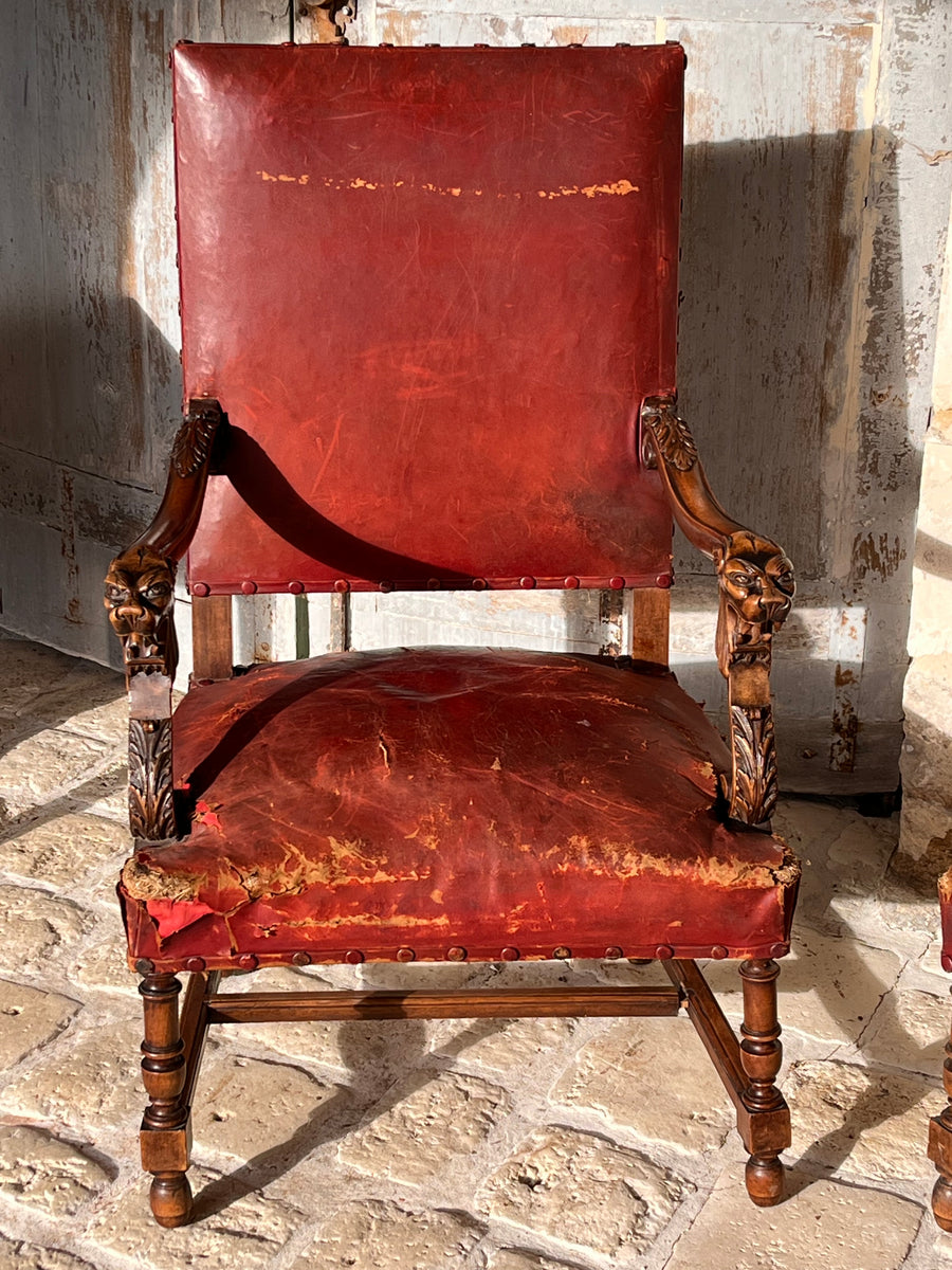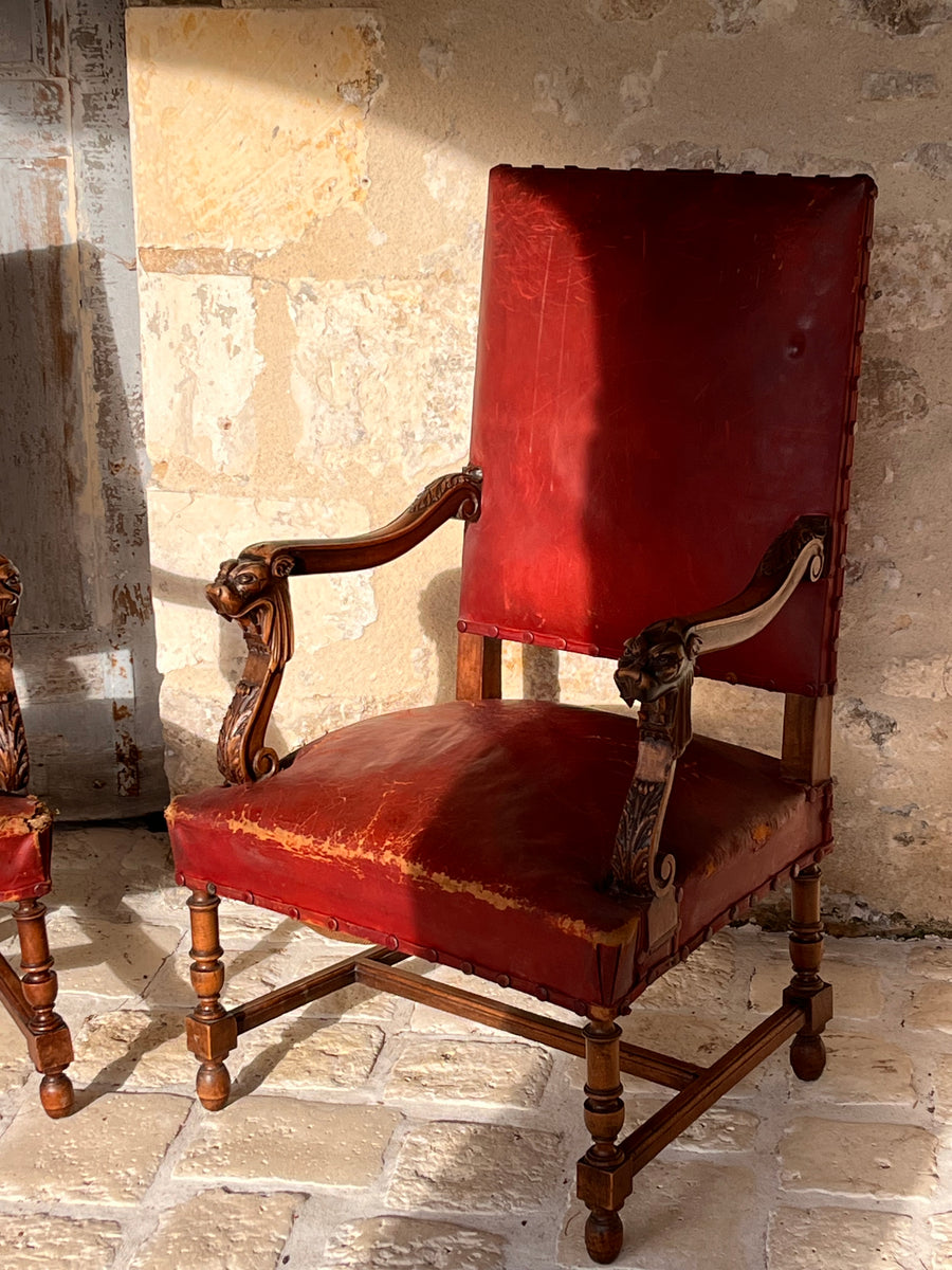 Pair of 19th century Louis XlV style fauteuils in original burgundy red leather with covered studs. Sturdy and strong chairs. Carved lion heads and agapanthus adorn the arms. The leather is worn on one corner of one of the chairs exposing the original horse hair upholstery SIZE HEIGHT 76cm depth 52cm Width44cm seat height 38cm