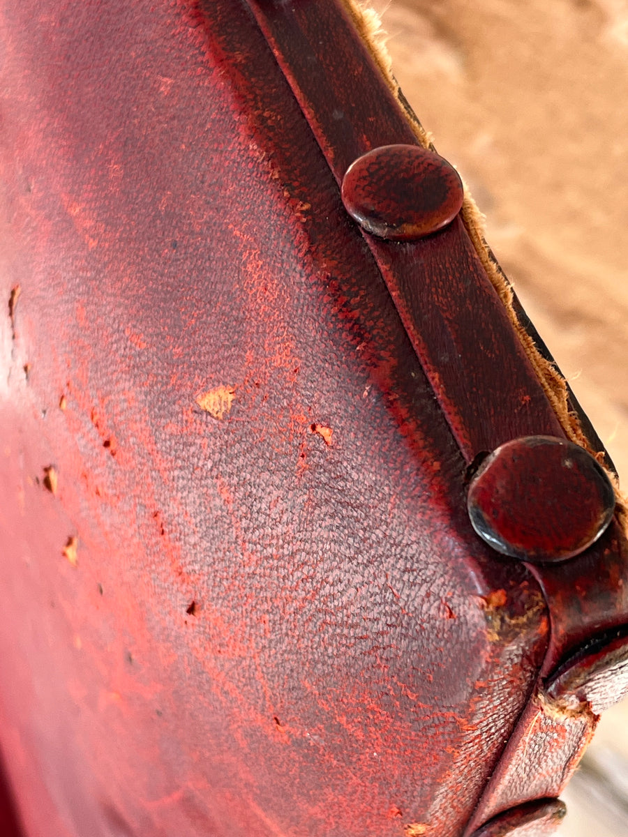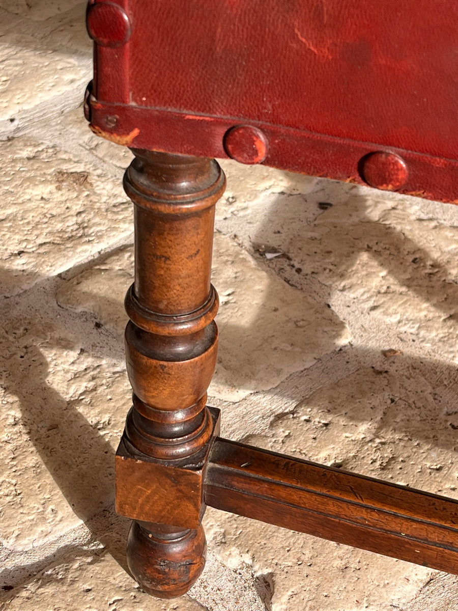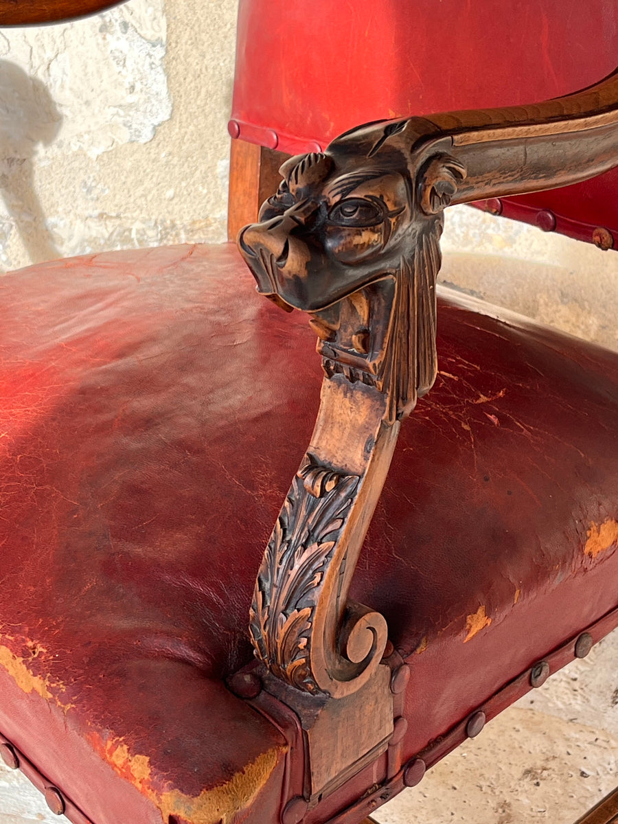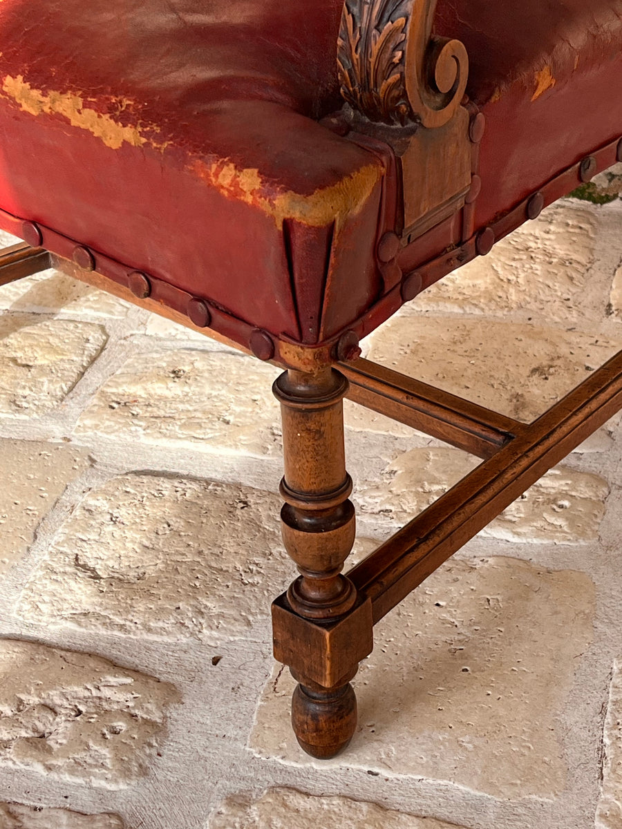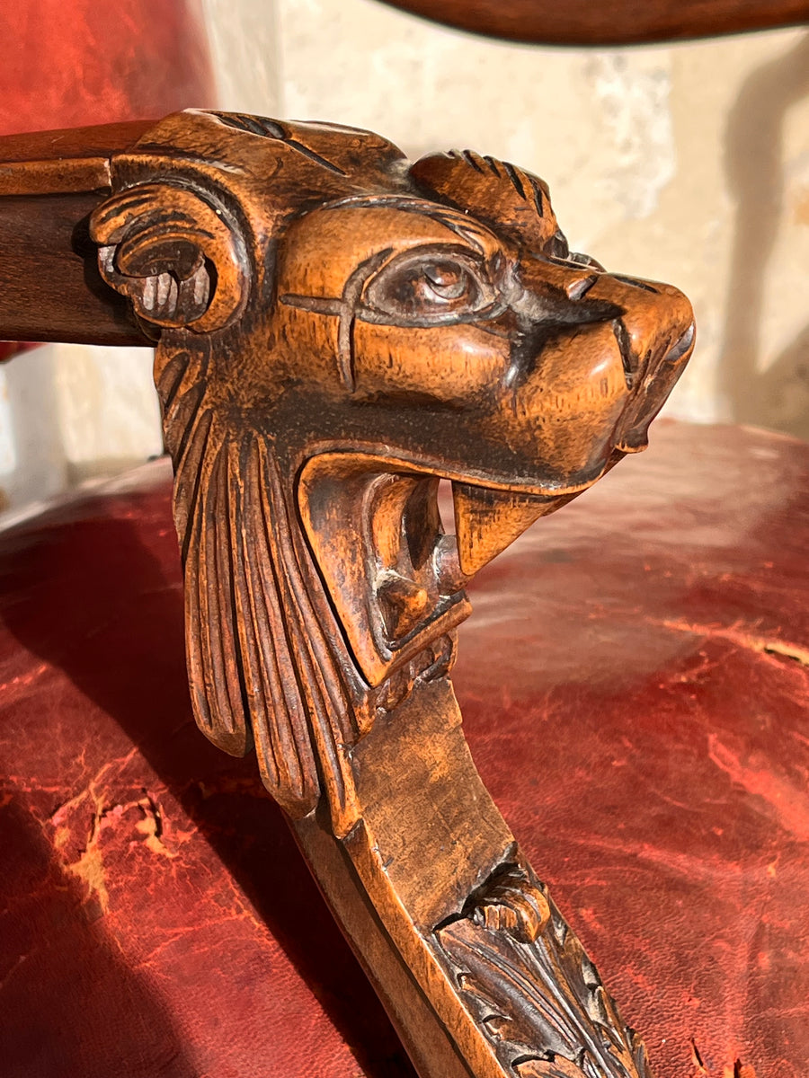 Pair of 19th century Louis XlV style fauteuils in original burgundy red leather with covered studs. Sturdy and strong chairs. Carved lion heads and agapanthus adorn the arms. The leather is worn on one corner of one of the chairs exposing the original horse hair upholstery SIZE HEIGHT 76cm depth 52cm Width44cm seat height 38cm