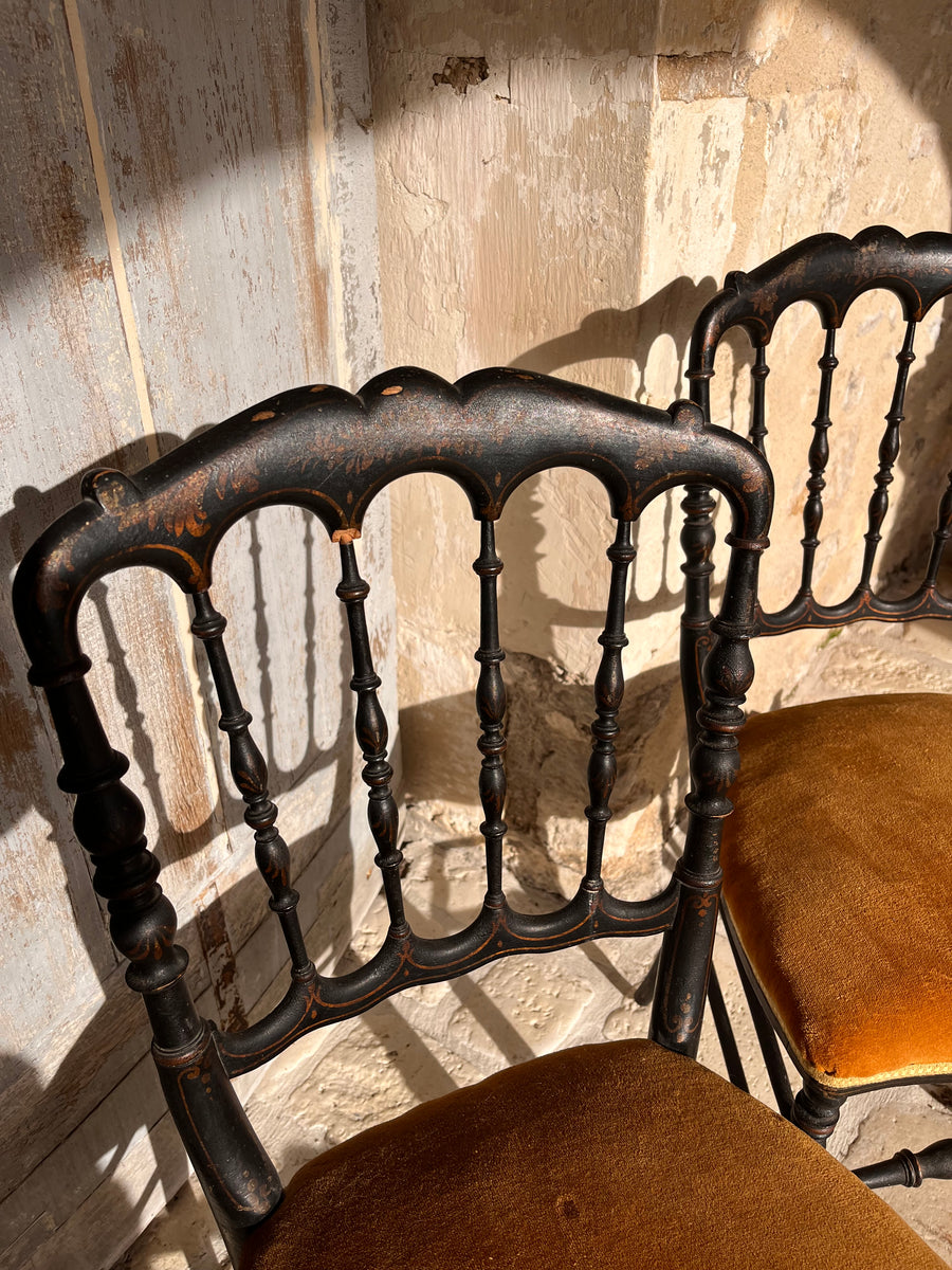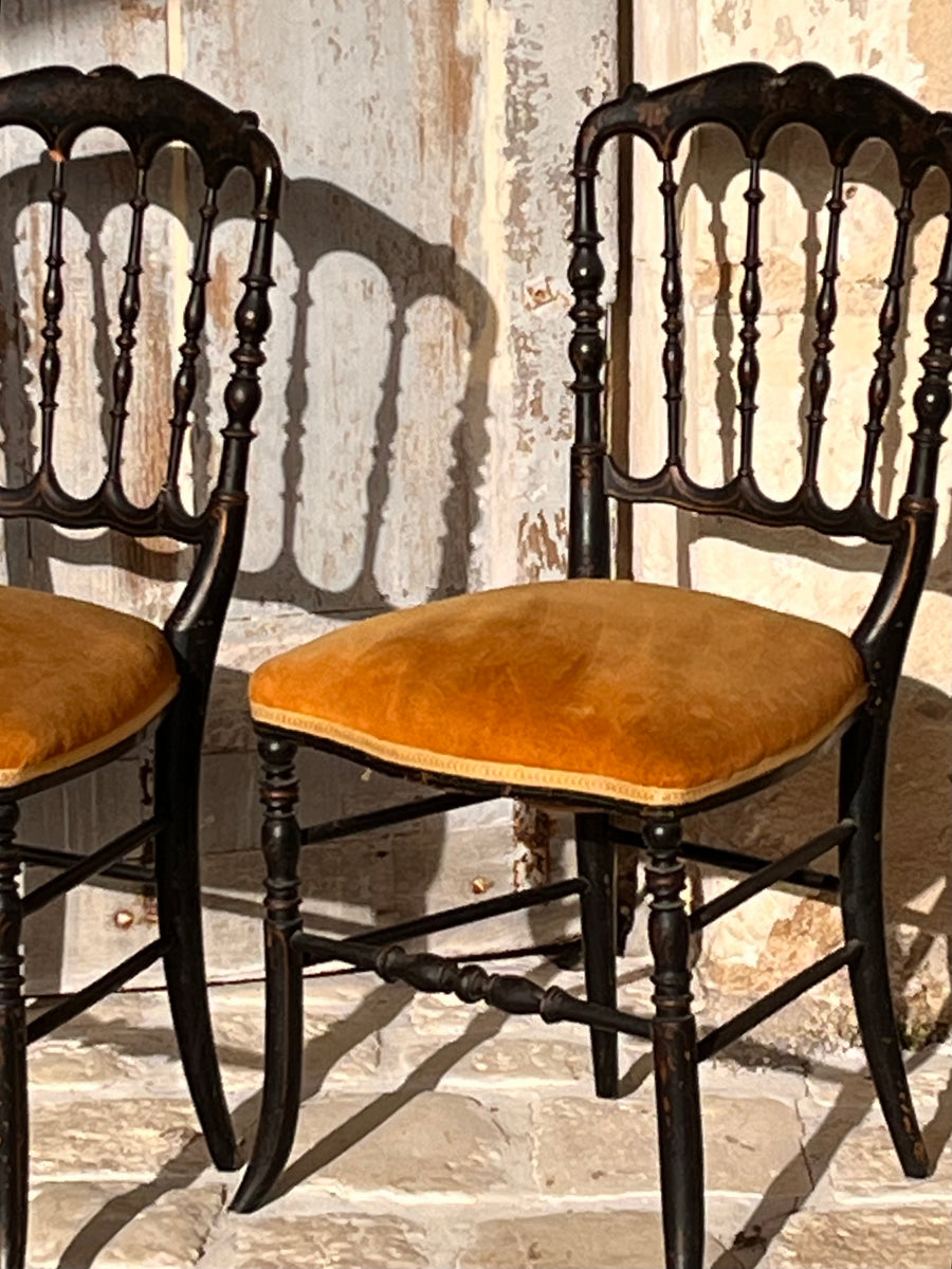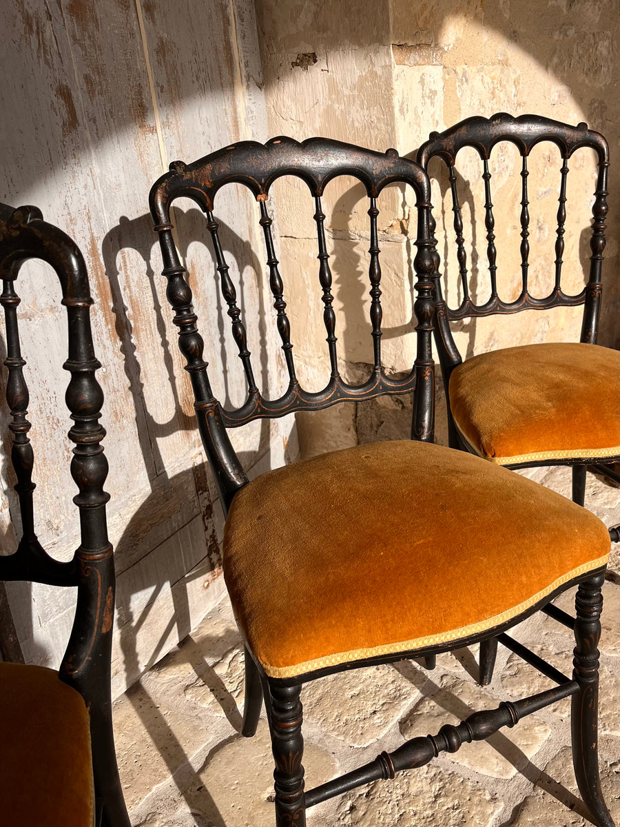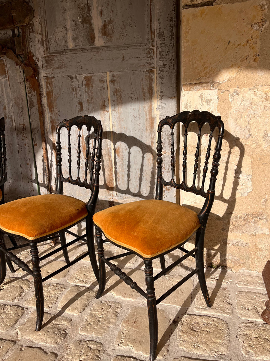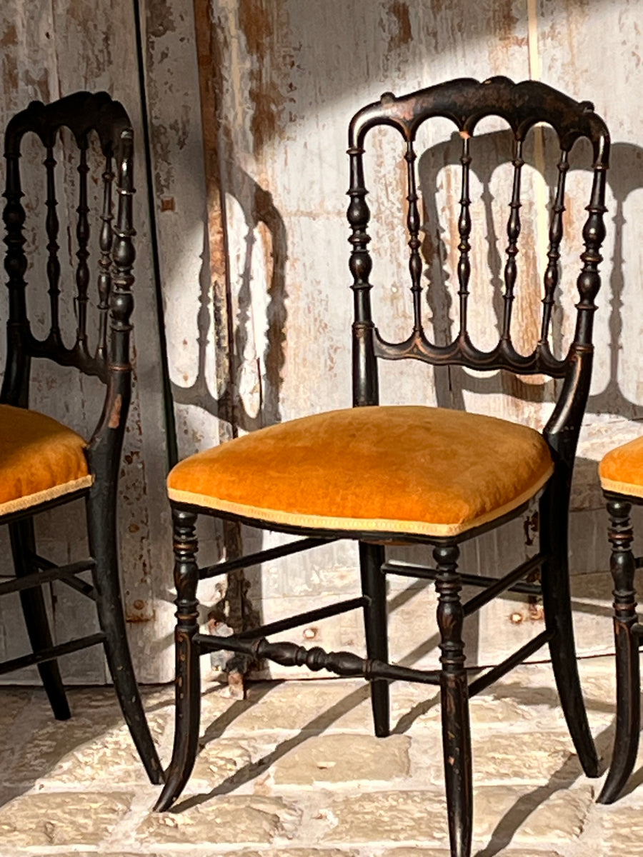 A set of four Napoleon III ebonised side chairs circa 1850’s they are very strong and sturdy construction but elegant. Would be fabulous bedroom or hall chairs. The upholstery could be original mustard velvet and well sprung. There is some wear to the guilt pattern as shown in pictures and a slight chip in one chair size height 84cm depth 38cm width 45cm seat height is 46cm