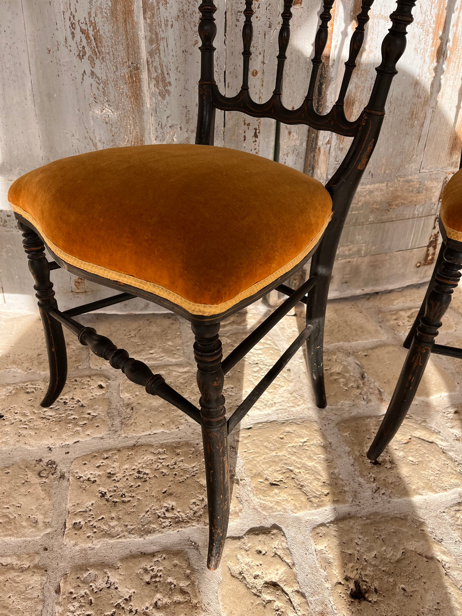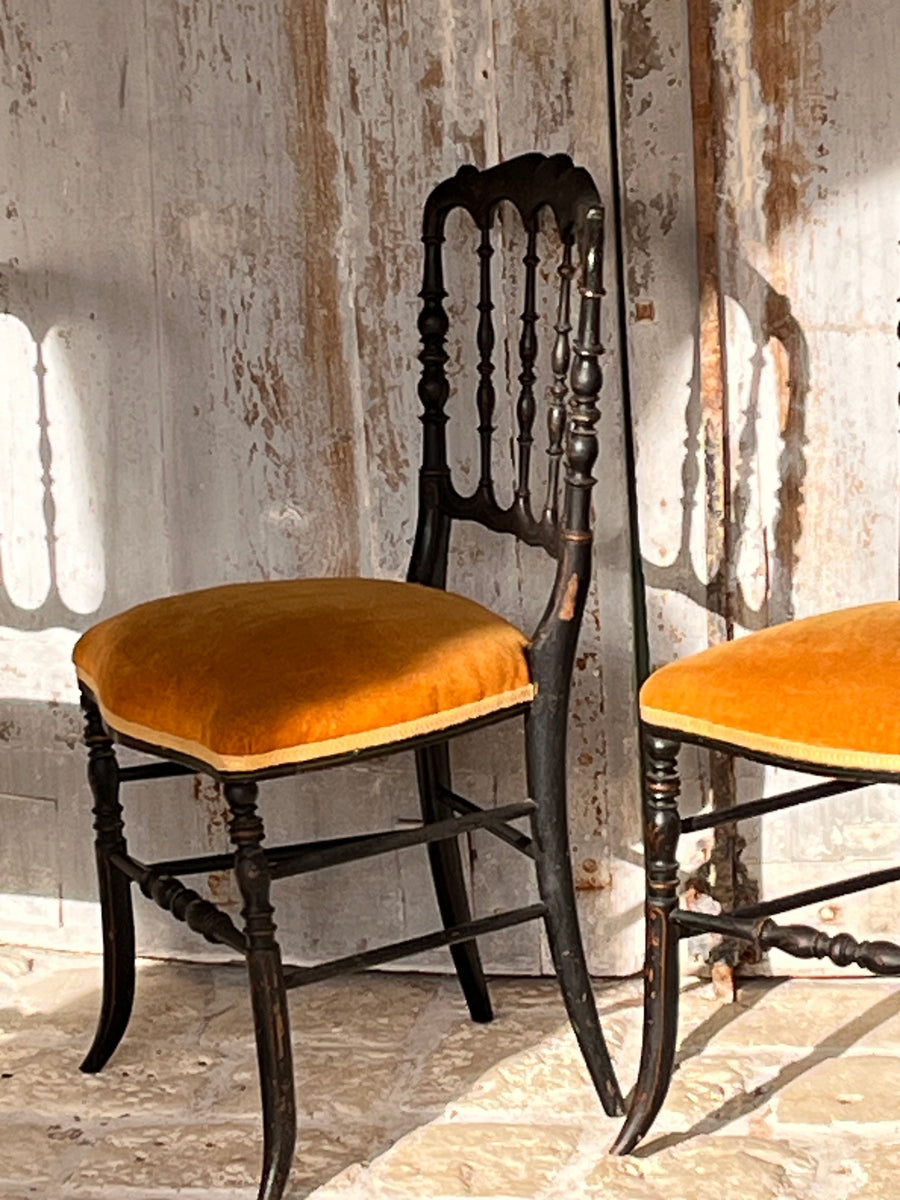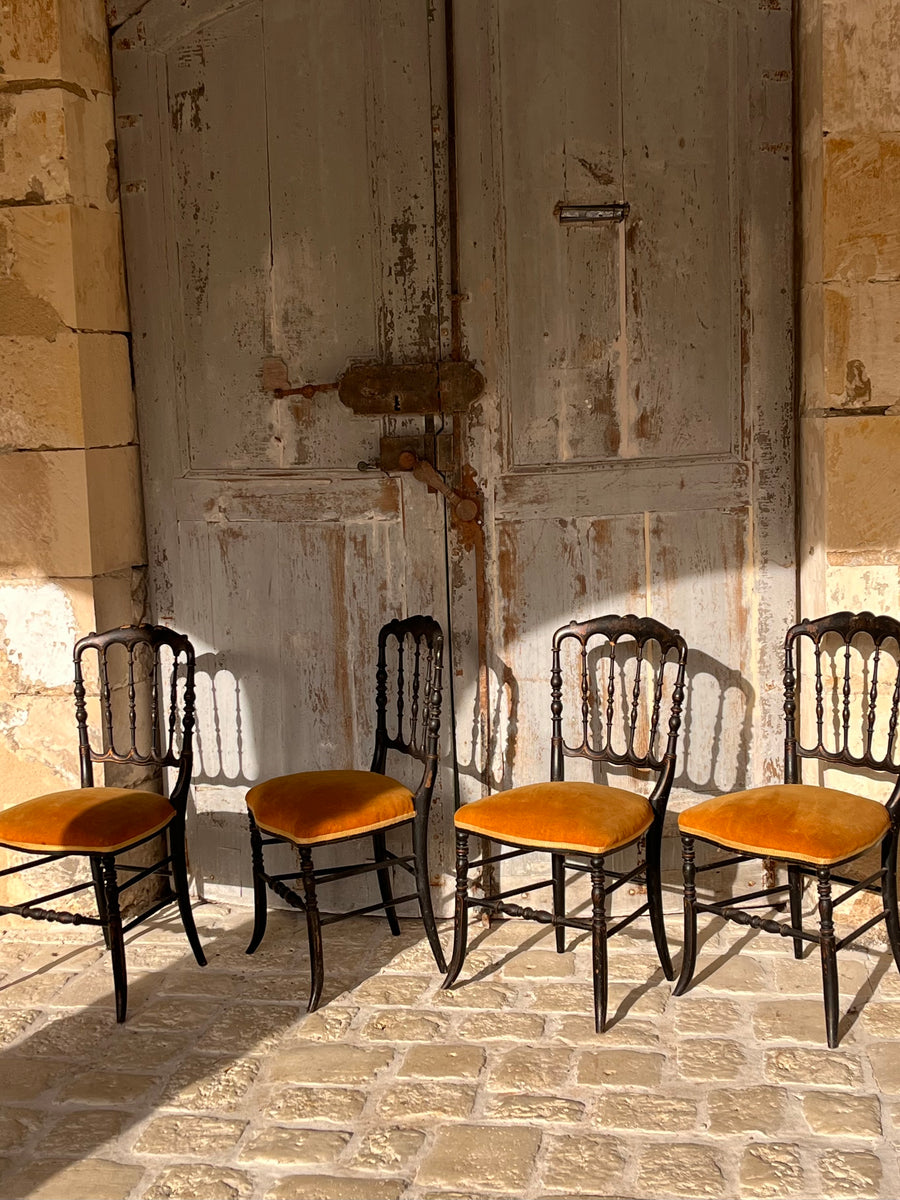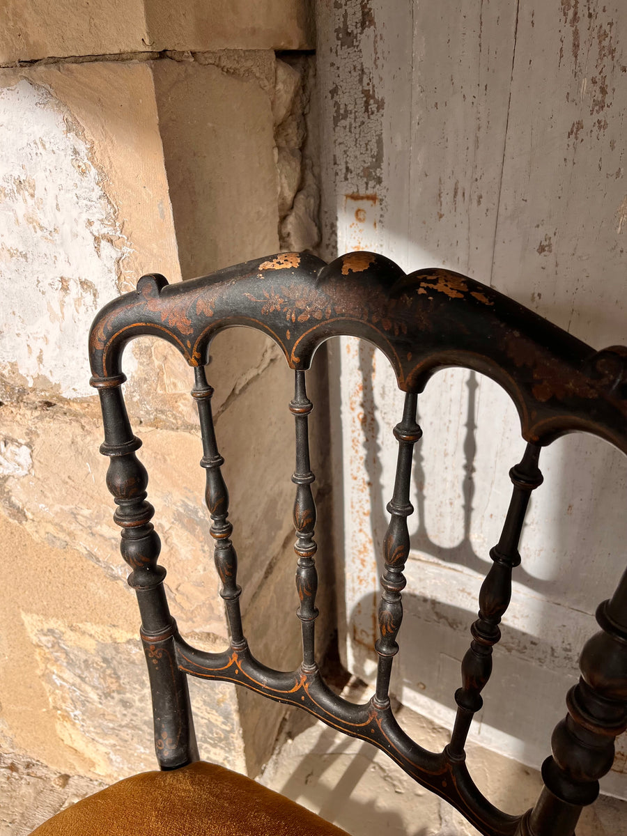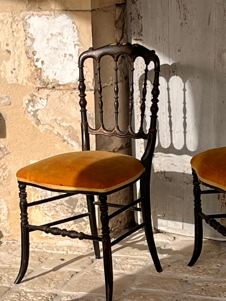 A set of four Napoleon III ebonised side chairs circa 1850’s they are very strong and sturdy construction but elegant. Would be fabulous bedroom or hall chairs. The upholstery could be original mustard velvet and well sprung. There is some wear to the guilt pattern as shown in pictures and a slight chip in one chair size height 84cm depth 38cm width 45cm seat height is 46cm
